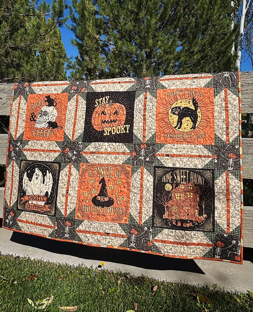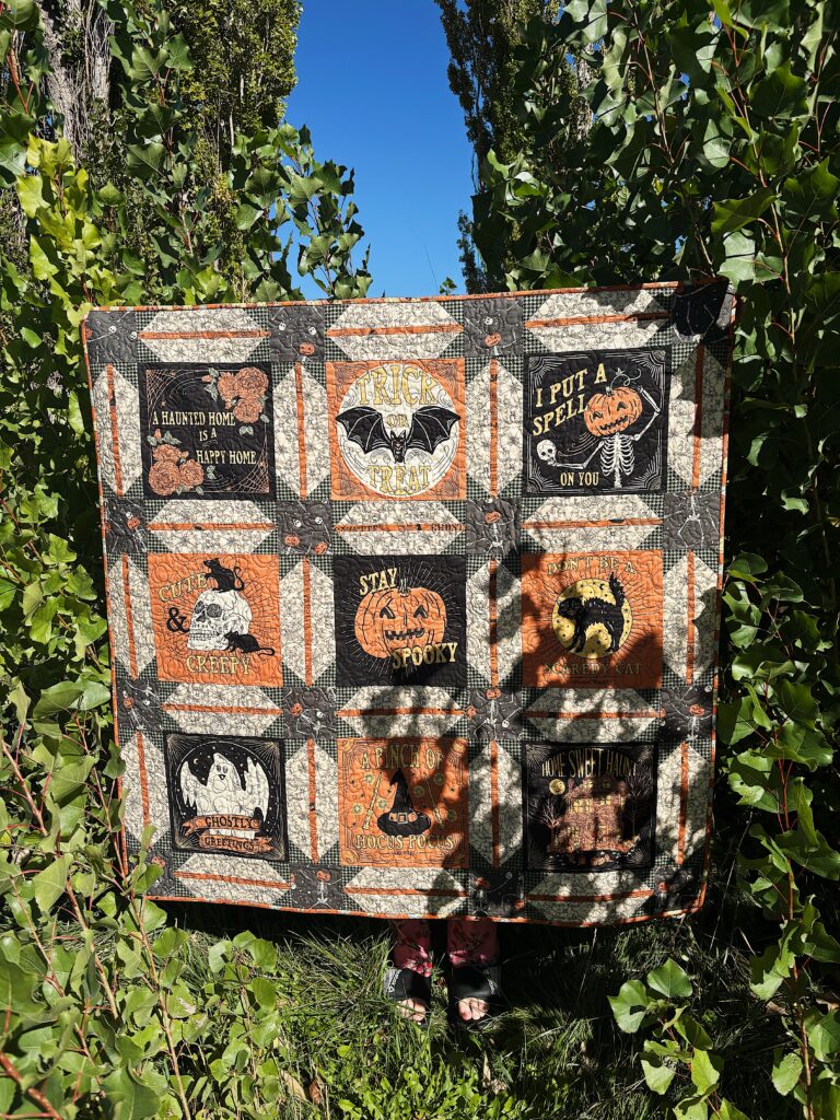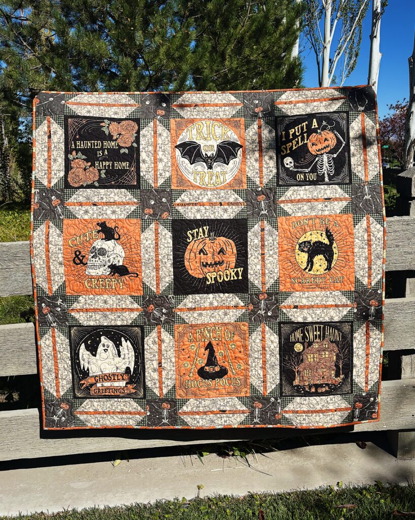 This easy showstopper quilt features a Home Sweet Haunt panel by Stacy Iest Hsu. The artwork in it is just spectacular. I wanted to make up a quick and easy quilt that really shows off the individual panels. Of course, I had to complicate it just a bit, but I think the finished quilt is totally worth it. I’m going to share a quick tutorial for how I made the sashing, and you can adjust the dimensions for the panel you are working with. My quilt finished at approximately 50″ square- a decent sized lap quilt. If you want to make it bigger, you can add another border to the outside of the quilt.