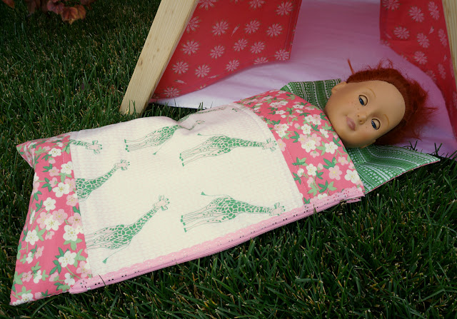 Whenever I make a project, I always hope that it will do two things- show off the fabrics I love, and be something useful, practical or fun. When I saw this Safari Party fabric from Melissa Mortenson for Riley Blake I knew immediately what I wanted to create with it- this fun cozy sleeping bag for my daughters and their 18″ dolls. The hardest part was figuring out how to get it come together. I wanted it to have the feel of a real sleeping bag, with a zipper, but I also didn’t want to have to use a separating zipper. I came up with a fun compromise- using these darling lace zippers I have loved forever, but never had a project to use them on, until now!