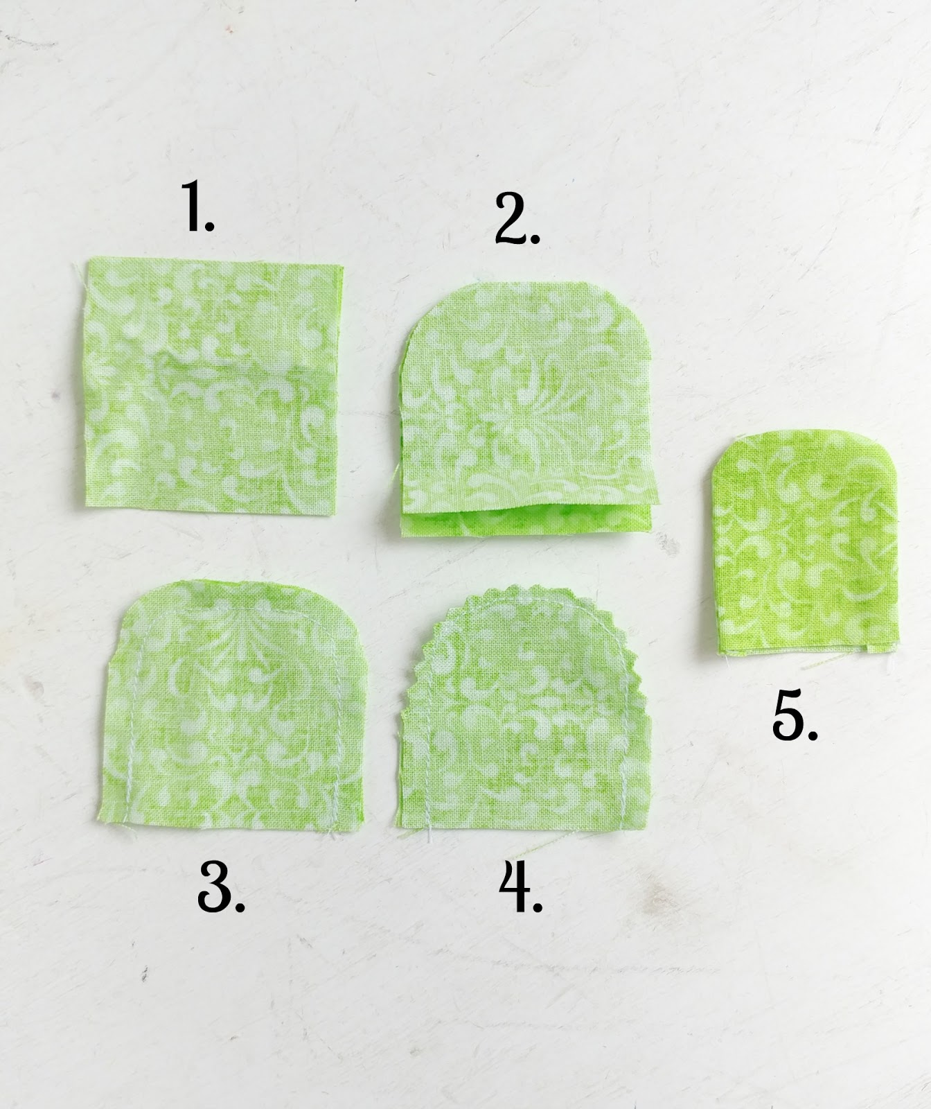 - Round the two top corners of the leaf pieces. (note: the larger leaves are 3″ tall and 2″ wide)