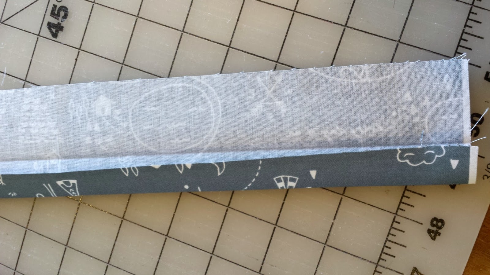 Take the strip of fabric, press in half along the length. Open up the halves and fold the long edges into the crease. Fold along the crease again to enclose the raw edges. Edge stitch along both sides of the strap.