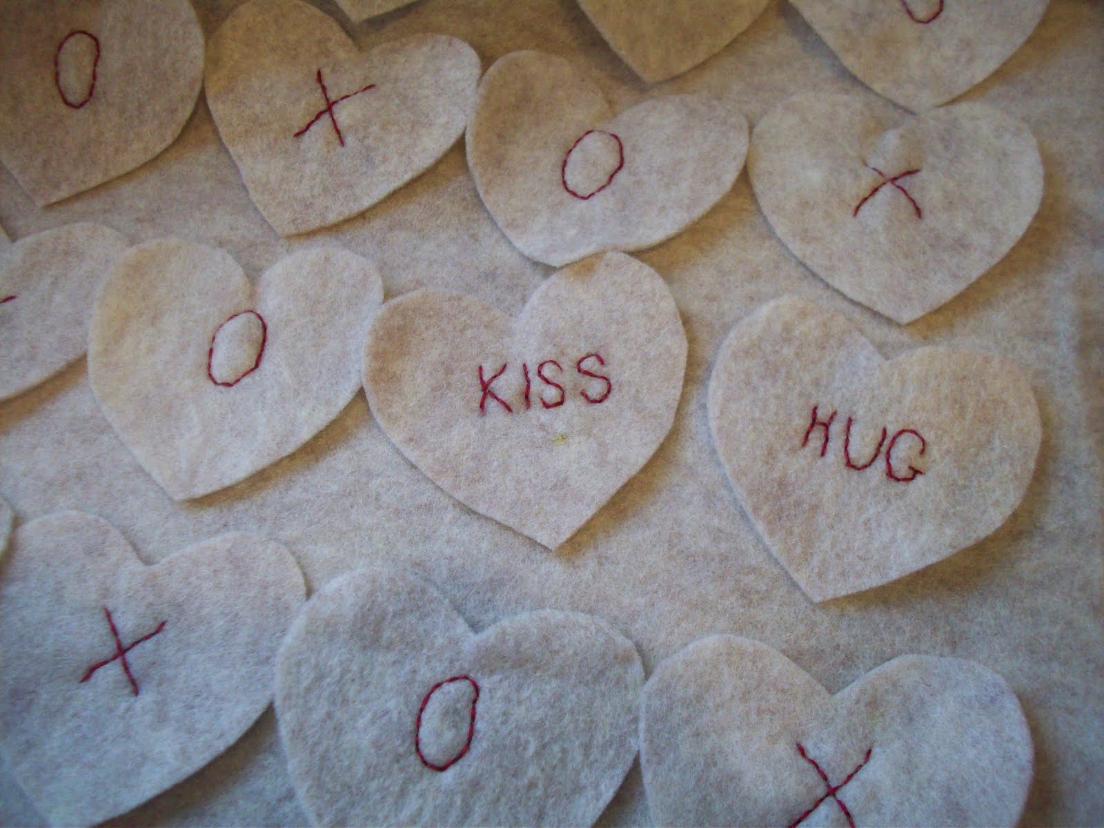 Next, I took three strands of embroidery floss and stitched X’s and O’s in alternating patterns in the center of the hearts.