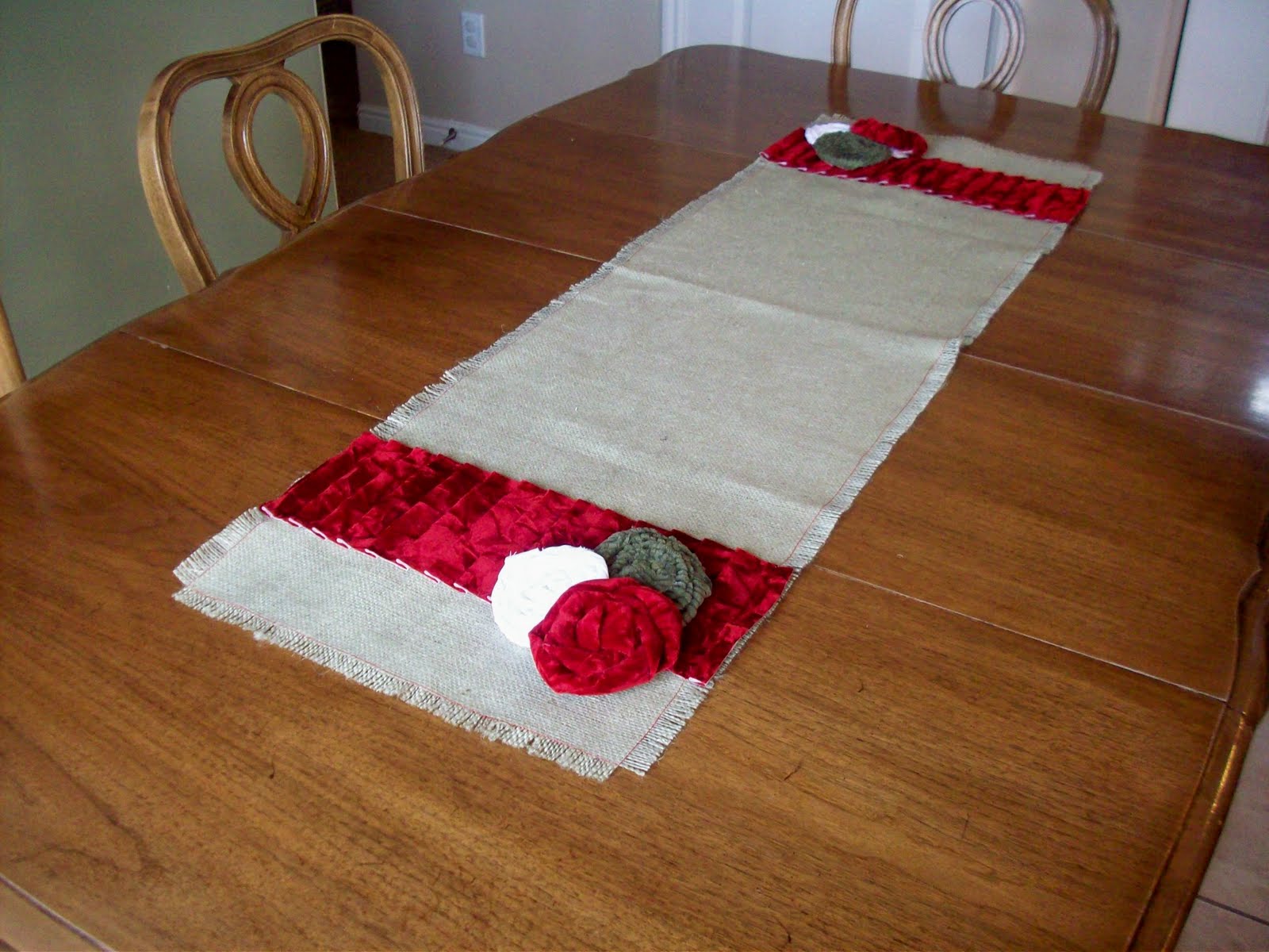 The second idea I had was for this Christmas table runner. I found this lovely sage green burlap at Joann’s and thought it would be fun to use for the holidays. My mother-in-law had this great crushed velvet- and a very inexpensive statement for the table. (the burlap is less than $3 a yard and I only used a 1/2 yard cut) Now I just need to come up with a centerpiece that I can easily move out of the way so it doesn’t get ruined by all the little hands around here! 😉