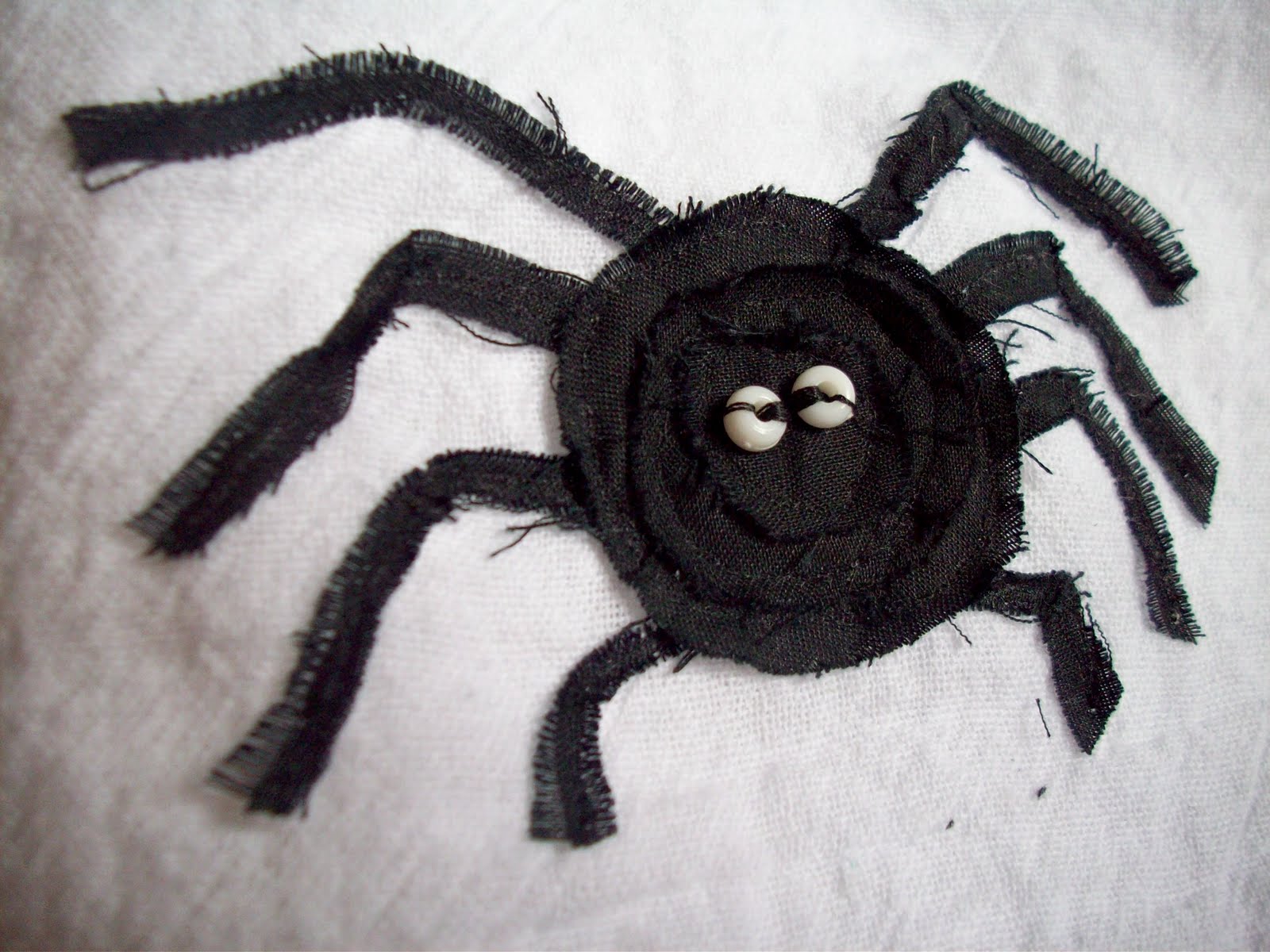 I was playing around with some new dishtowels I bought and wanted to try out this idea for a spider. I cut out the legs and just sewed them up the middle of the strip, I wanted them to fray. The body is three graduated circles all sewn one on top of the other, again leaving the edges to fray. I sewed on beads for the eyes- and Done! A new halloween dishtowel.