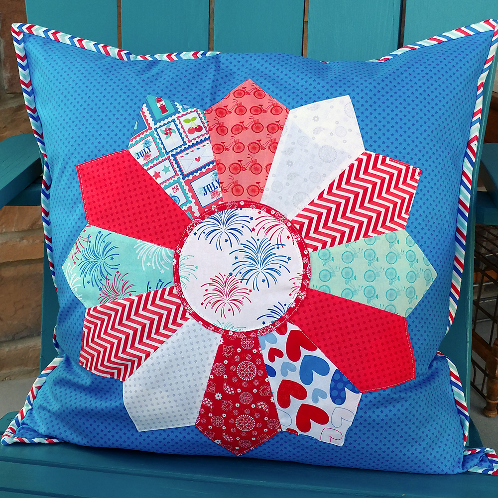 I am so excited to share with you this Patriotic Dresden Pillow. I was sent a dresden ruler from Nancy’s Notions and decided it was time to start adding some accessories to my front porch, and a pillow for my prized chairs built for me by my dad more than 15 years ago would be a great place to start. The hardest part was choosing fabric. Sometimes you hang on to fabric for a while waiting for just the right project to come along. That happened to me with the Doodlebug Designs Star Spangled fabric bundle. I’ve had it for 3 years now just waiting for the right thing, and this project was the winner.