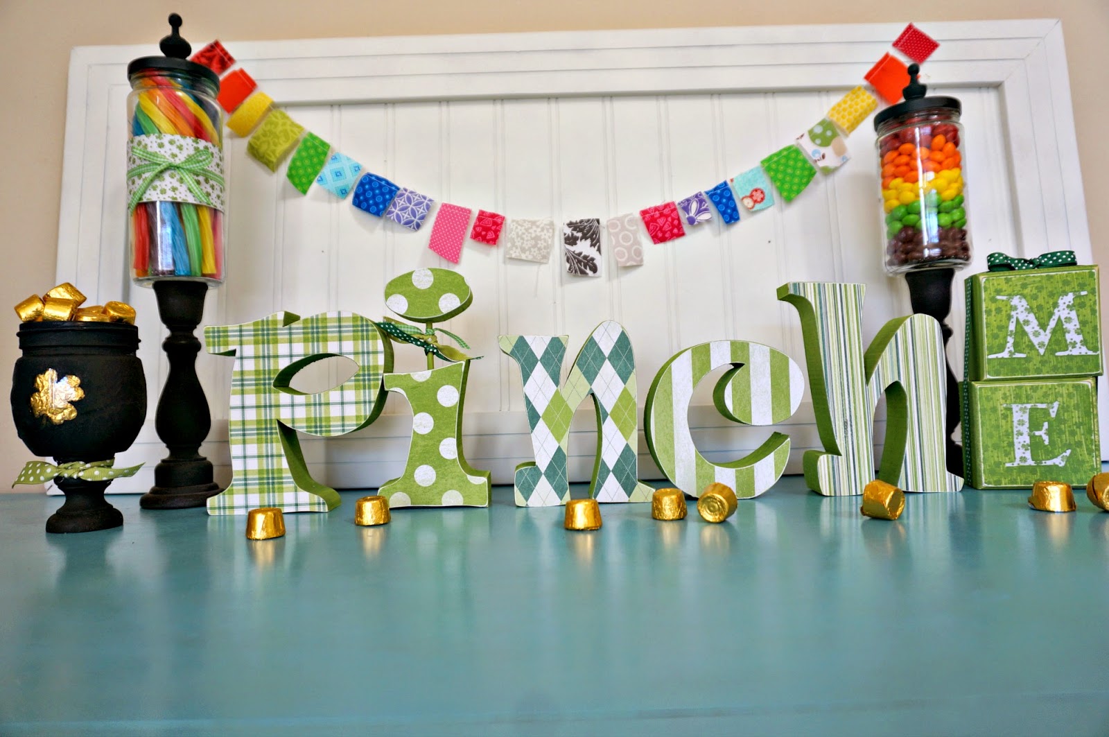 I don’t have many decorations for St.Patrick’s Day but this one makes me super happy. I love the letters and wood, but the small mason jar pot of gold just might be my favorite. That or the rainbow order jars of candy. 😉