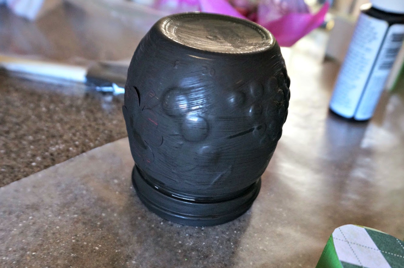 Then I just used acrylic paint and a foam brush to paint the jar black. It took two coats of paint to get decent coverage. Wait until the paint is DRY before removing the stencil on this project. I know that you can use other types of paint for glass, but this is what I had on hand and it worked great. I might take it out and seal it with a clear acrylic spray when the weather warms up as this paint has a tendency to scratch easily. While I had the paint out I painted the small candle cup black also, to use as a base for the Pot of Gold.