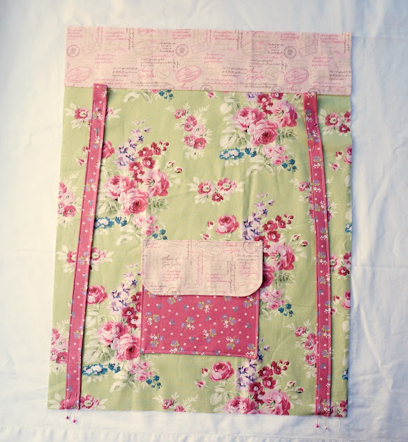 1/4 yard accent print for ruffle and pocket flap (light pink quote fabric)