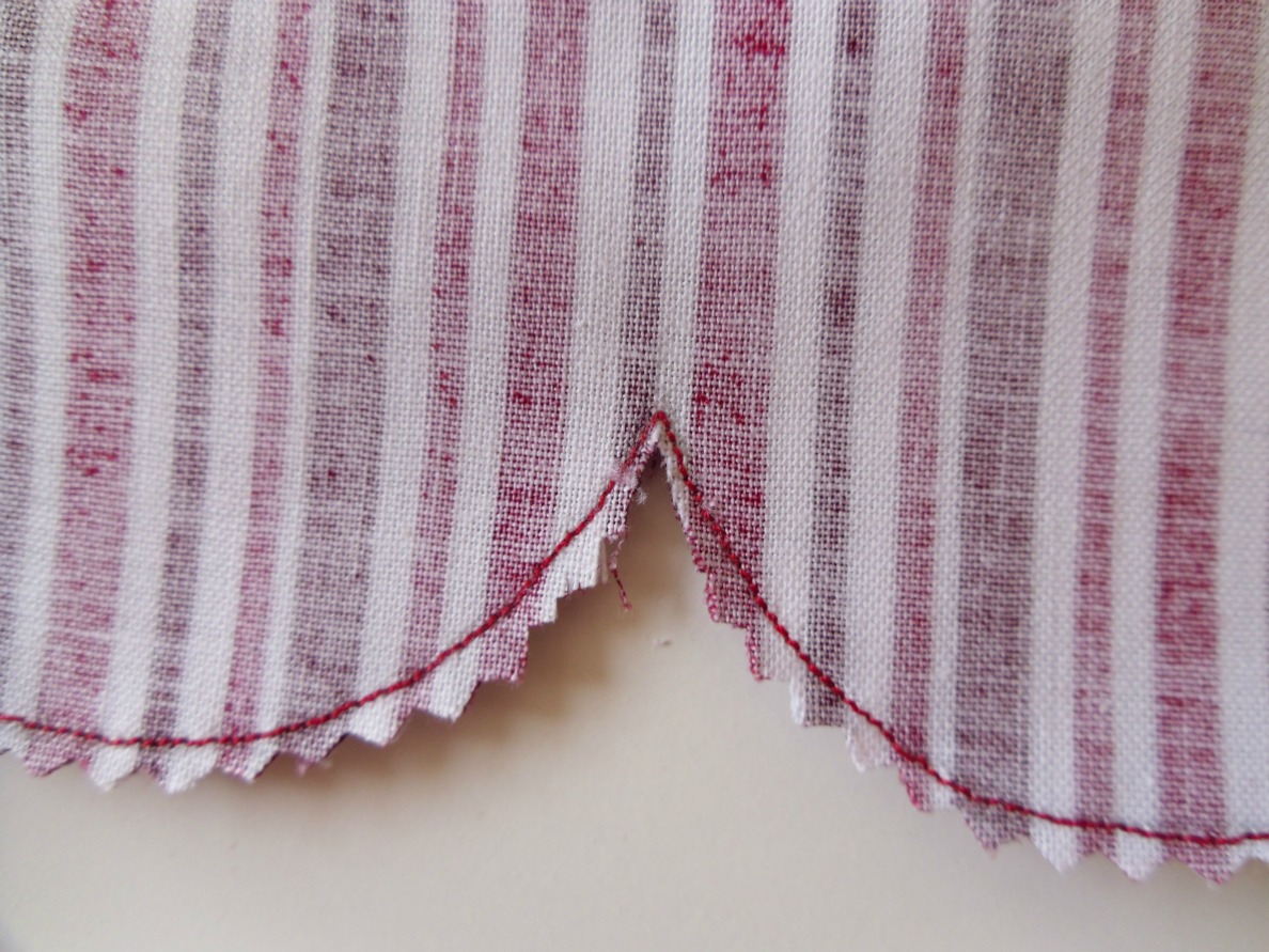 Shorten your stitch length to a fairly small stitch and sew along the scalloped line. Pivot at the “ditches”. Then cut out the bottom hem. I use pinking shears so I don’t have to cut the wedges into the curves, but if they aren’t available to you you can cut out the scallops leaving a 1/4″ seam and notch the curves so they lay flat.