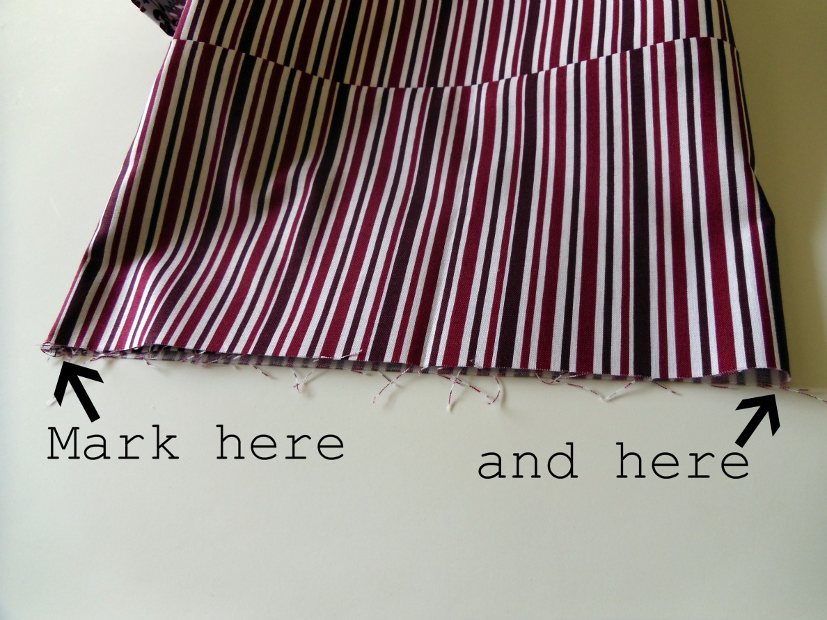 Sew down the hems we have just created using a scant 1/2″ seam allowance for the skirt hem and a scant 1″ s.a. for the elastic casing- making sure on the casing to leave an opening to thread the elastic through. (approx 1″)
