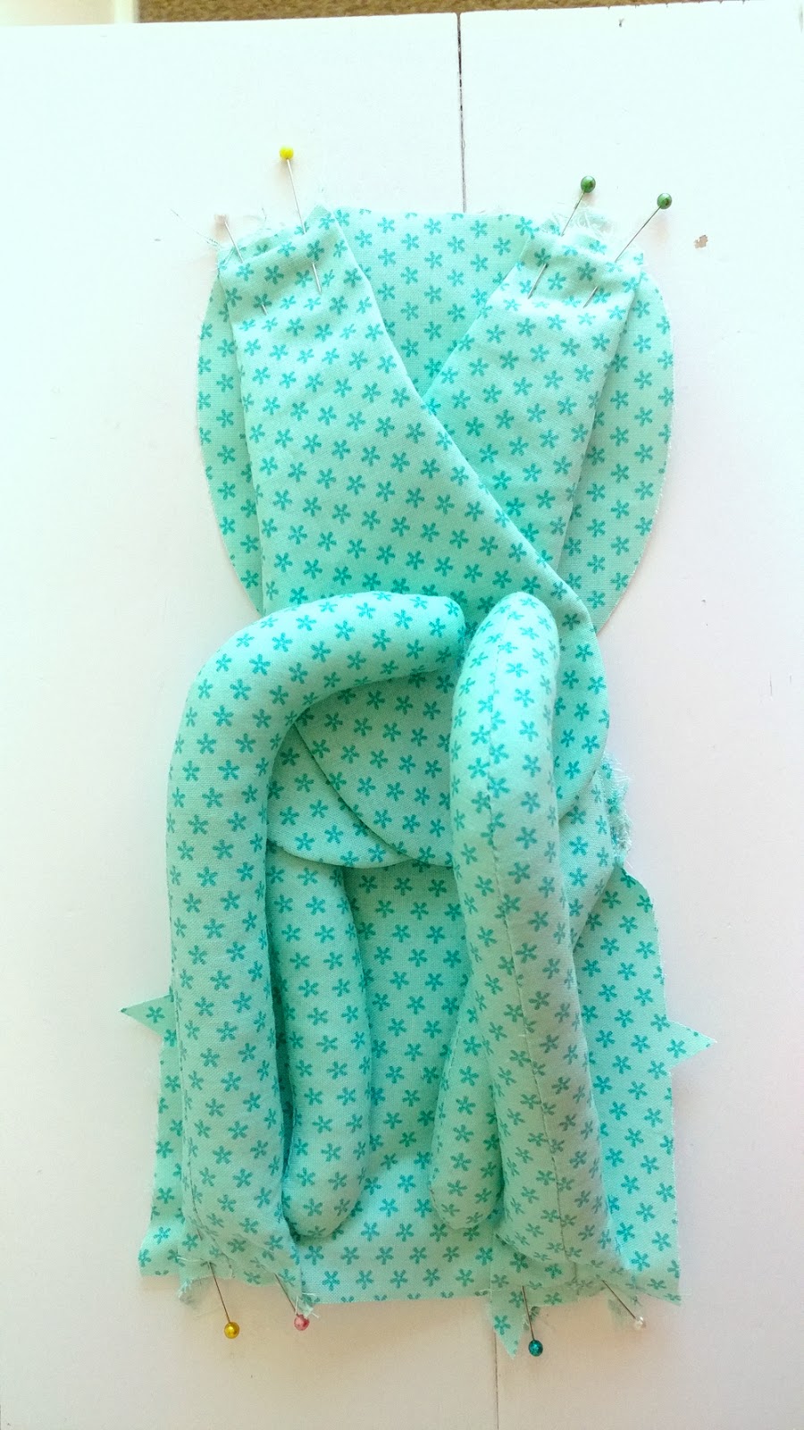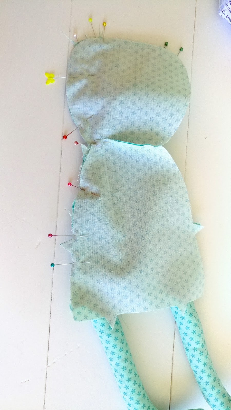 Now it’s time to do the bottom. Feed your legs up and into the body of the bunny. It might take a bit of manipulation to get the feet through the neck. Get the bottom as neat as you can and pin from the inside of each leg and around the corner to where your stitching stops. Sew the two legs in, leaving the space between the legs open for stuffing. Make sure to back stitch when starting and stopping- especially the opening where you will turn the softie right side out and stuff it!!