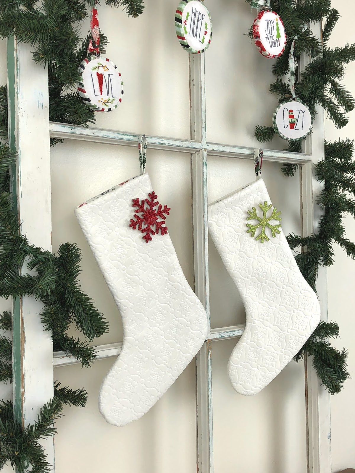 I cut chipboard snowflakes out using the knife blade on my Maker to embellish the stockings. Once they were cut out, I covered them with glue and glitter and hung them on the stocking using monofilament thread. I love the fun element they add!!