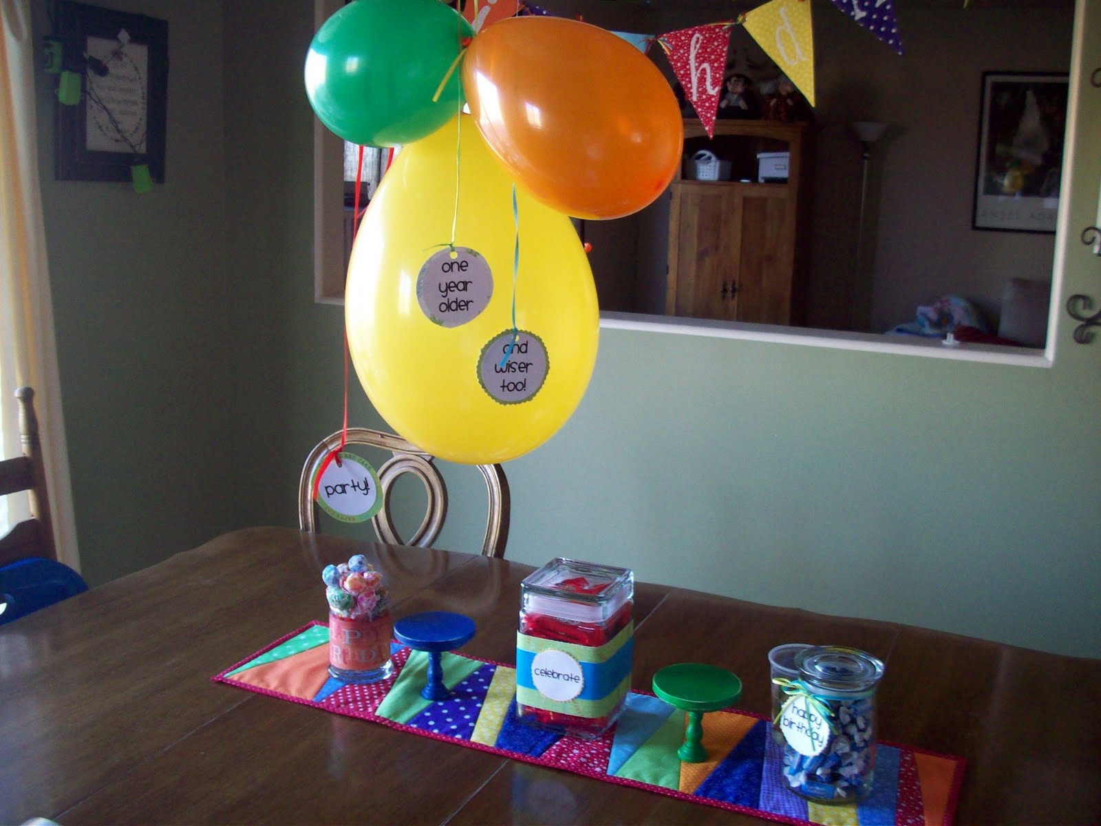 The night before the birthday, we bust open the box! All it takes is a an hour or so, a good pair of lungs (thanks, honey) and some candy-filled jars. PRESTO! Instant party!