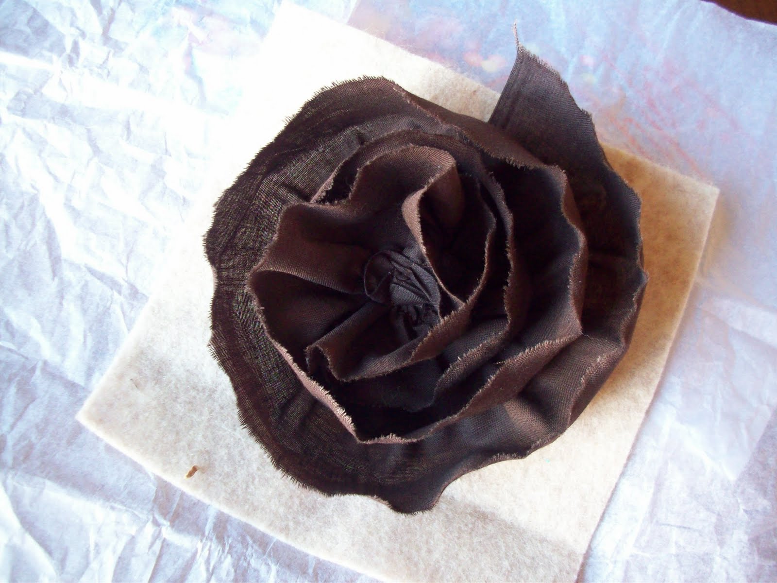 Trim off the excess base fabric. I usually just tack down the starting edge (but only the top corner) to the next layer of ruffle so it doesn’t stick out. If you find the flower is too tall for you, you can cut it down to the desired height now.