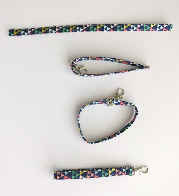 Before I go I just want to give a couple tips on choosing fabrics: Try not to choose directional prints, they will be backwards at some point. These wrist straps last a LONG time!! And because of that, they get DIRTY! So, keep that in mind when looking at prints. Those with a colored background and small scale prints are best. I like deeper, richer colors too, they hide the wear a bit better. But, the good news is that as long as your lobster clasp isn’t damaged, you can just cut off the old fabric and sew up a new one super quick when your wrist strap starts looking a little sad. No need to walk around with a tattered keychain, right?